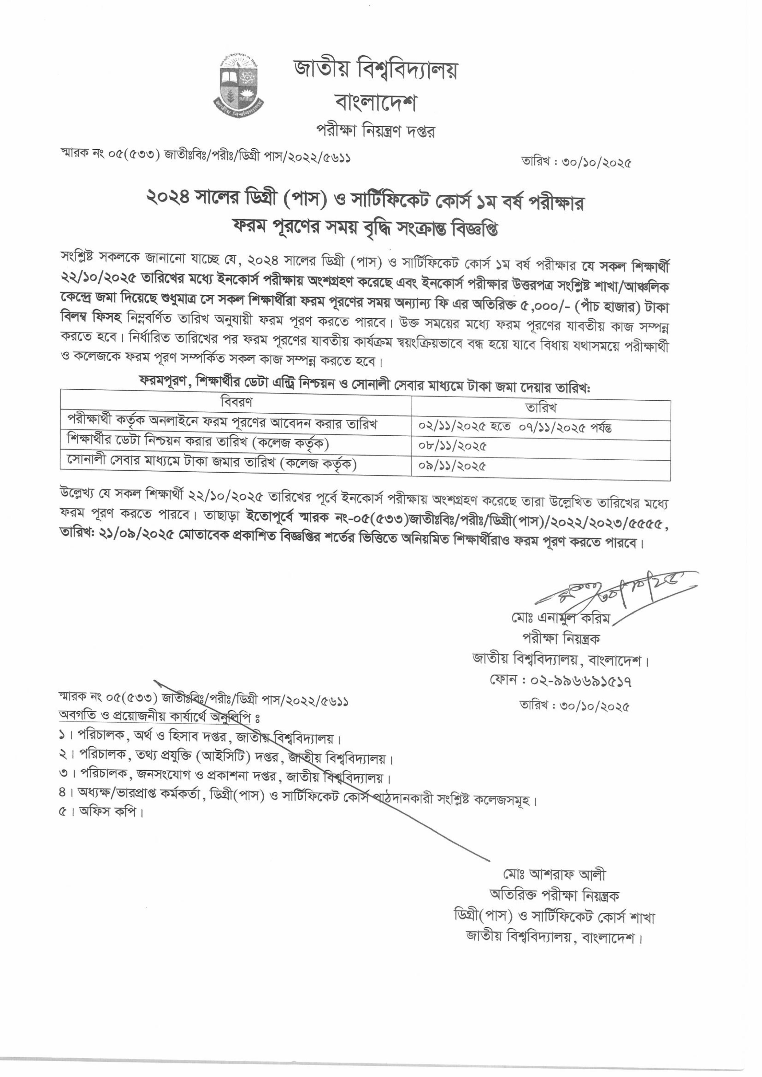 ২০২৪ সালের ডিগ্রি (পাস) ও সার্টিফিকেট কোর্স ১ম বর্ষ পরীক্ষার ফরম পূরণের সময় বৃদ্ধি সংক্রান্ত বিজ্ঞপ্তি প্রসঙ্গে। |