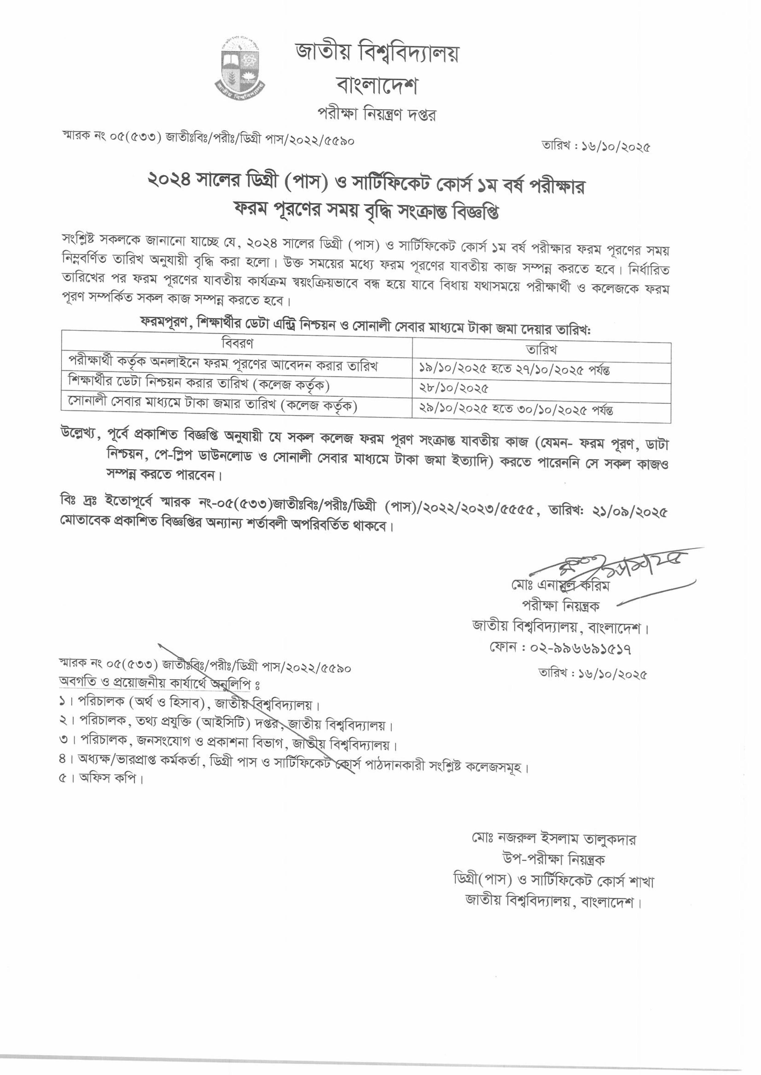 ২০২৪ সালের ডিগ্রি (পাস) ও সার্টিফিকেট কোর্স ১ম বর্ষ পরীক্ষার ফরম পূরণের সময় বৃদ্ধি সংক্রান্ত বিজ্ঞপ্তি। |