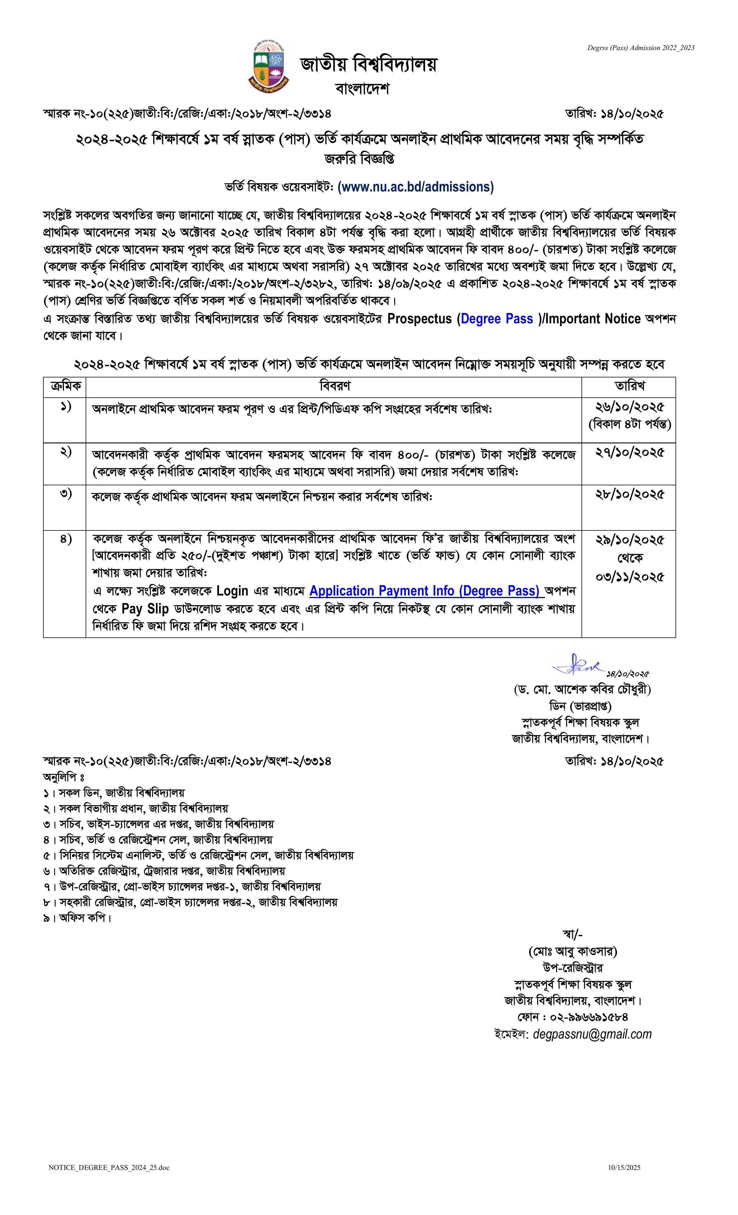 ২০২৪-২৫ শিক্ষাবর্ষে ডিগ্রি (পাস) ও সার্টিফিকেট কোর্স ১ম বর্ষে ভর্তি কার্যক্রমে অনলাইন প্রাথমিক আবেদনের সময় বৃদ্ধি সংক্রান্ত জরুরী বিজ্ঞপ্তি। |