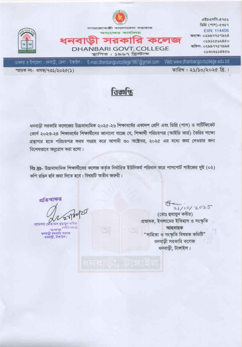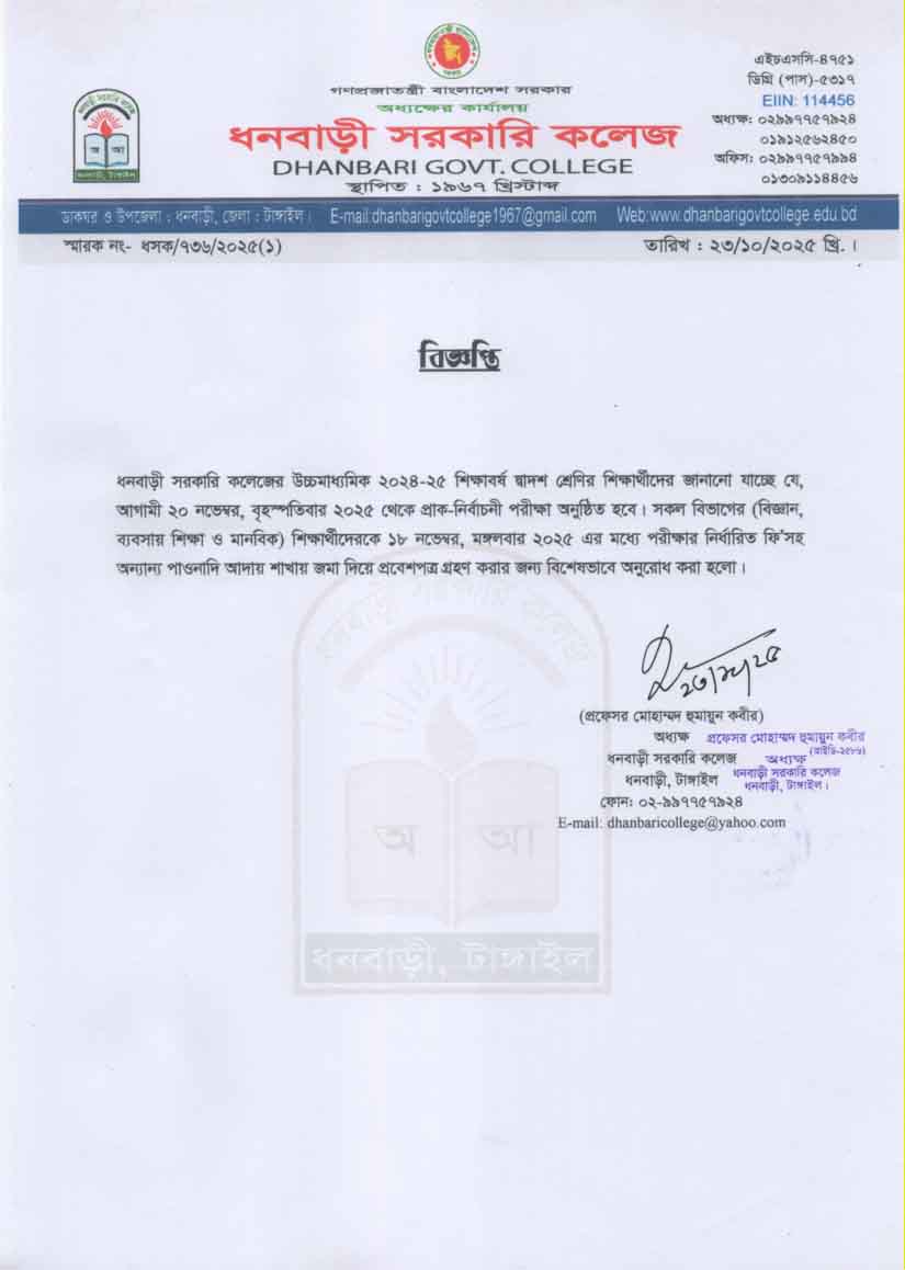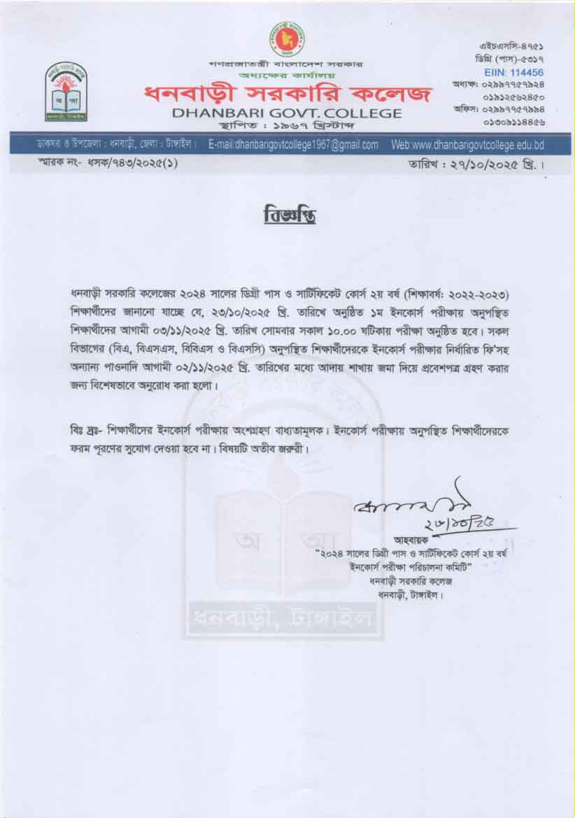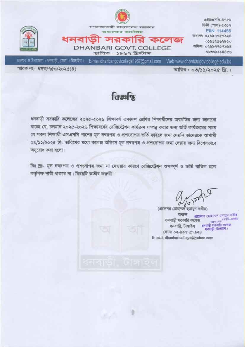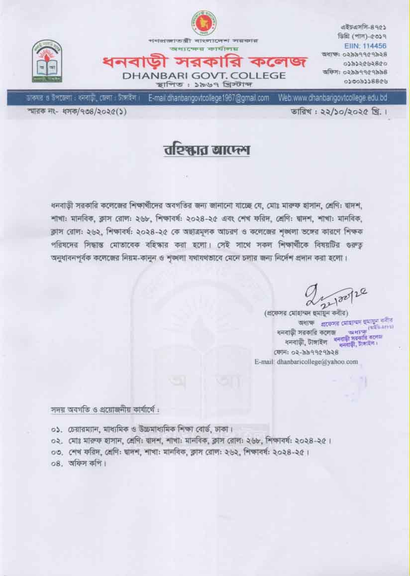 ধনবাড়ী সরকারি কলেজের উচ্চমাধ্যমিক ২০২৪-২৫ শিক্ষাবর্ষের দ্বাদশ শ্রেণির দুই (০২) জন শিক্ষার্থীকে অছাত্রমূলক আচরণ ও কলেজের শৃঙ্খলা ভঙ্গের কারণে বহিস্কার আদেশ প্রসঙ্গে। |