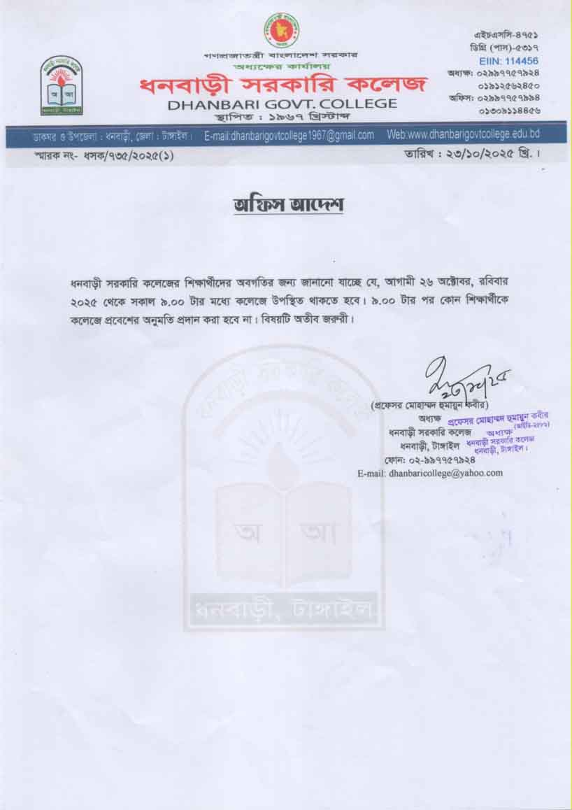ধনবাড়ী সরকারি কলেজের শিক্ষার্থীদের নির্ধারিত সময়ের মধ্যে কলেজে উপস্থিত থাকা প্রসঙ্গে। |
